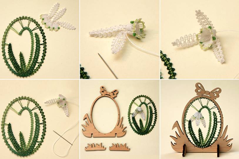 der Blüte zusammennähen, Blüte an den Stängel annähen. Klöppelarbeit
